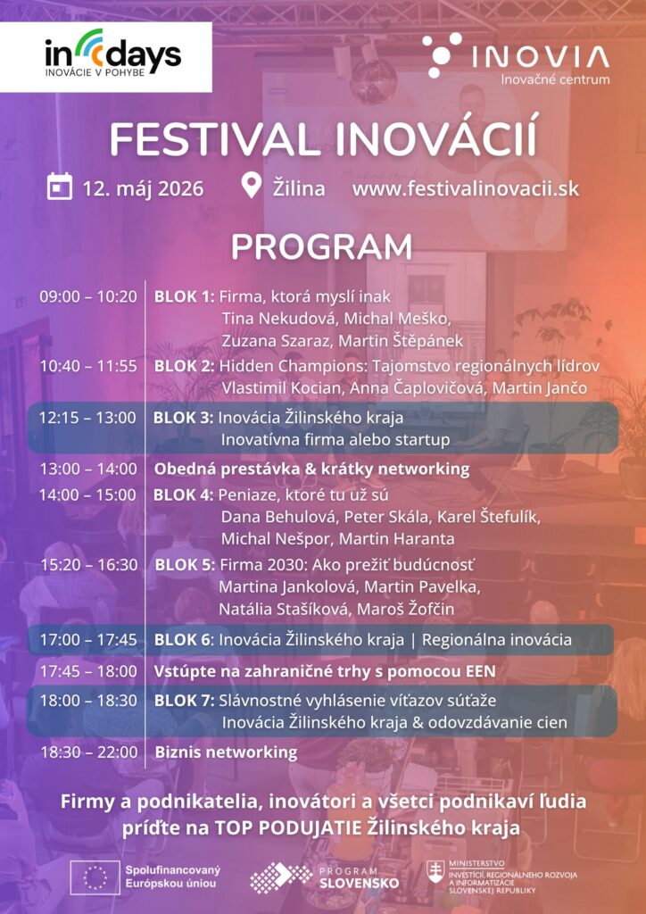 Zostaňte v hre aj v roku 2030. Objavte inovácie, ktoré menia región a prepojte sa s ľuďmi, ktorí tvoria budúcnosť. Malé a stredné firmy nepotrebujú ďalšiu teóriu. Potrebujú ľudí, kapitál a odvahu. Aj o tom bude festival, ktorý patrí k top inovačným podujatiam celého regiónu.